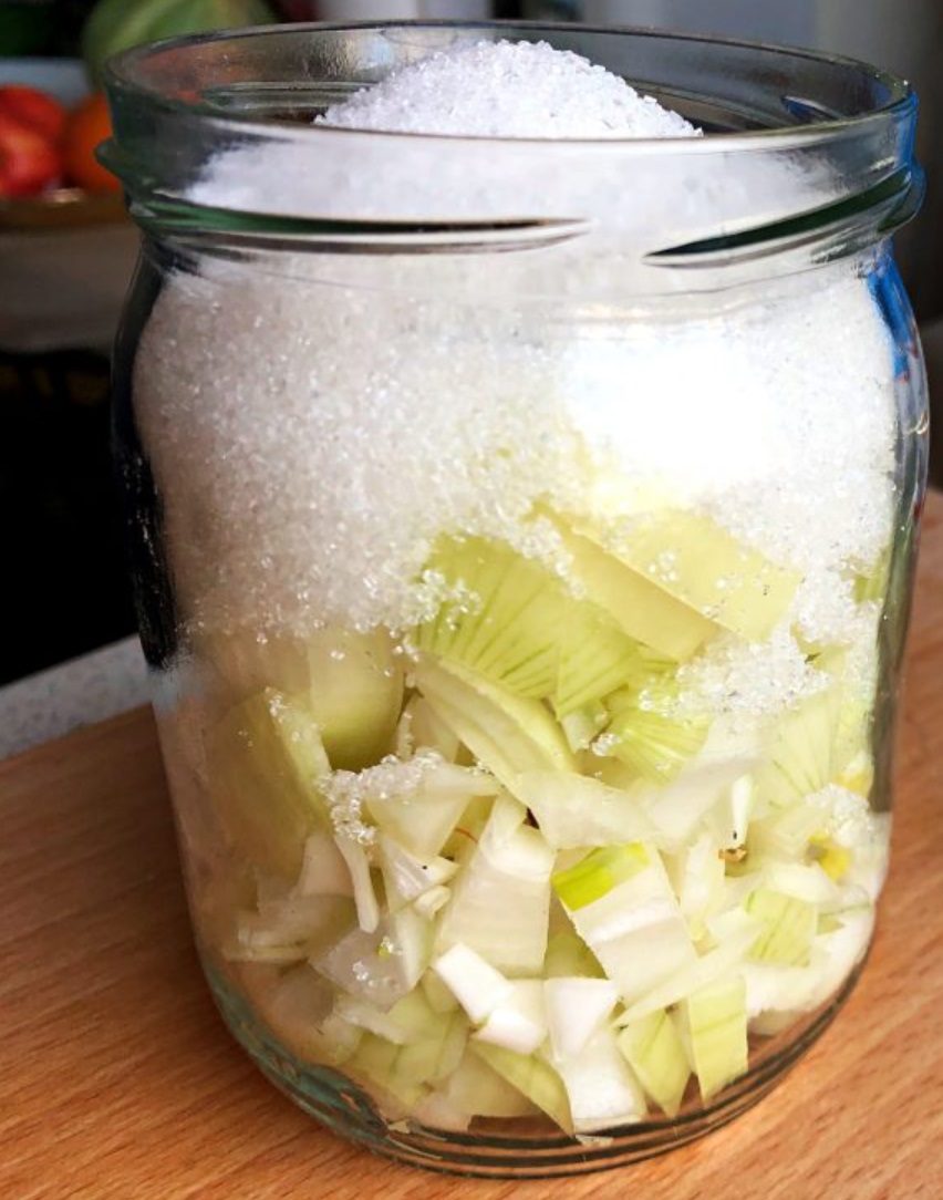 - Luego, córtala en trozos pequeños y espolvorea con azúcar. Después de unas pocas horas, la cebolla debería liberar su jugo.